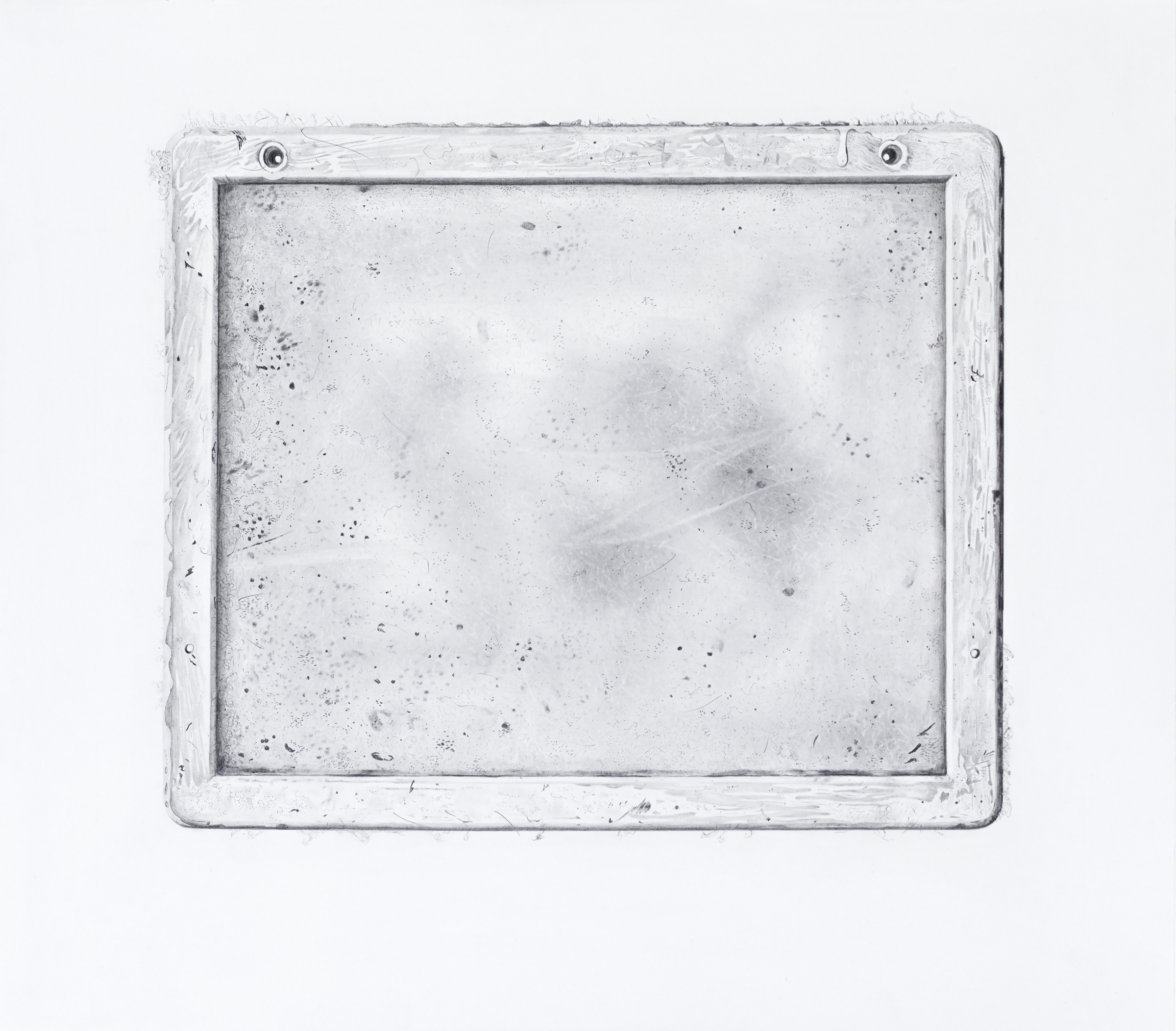 Where ‘Grief Tree’ is implicitly universal, the virtuoso graphite drawing ‘Family Mirror’, 2017, returns us to those close to Ballard herself. It depicts an occluded, tarnished mirror in which we can see no current reflection, but can muse on the history of who has been reflected in it: in this case, all the members of Ballard’s family, making it a poignant group version of Ballard’s abstract portraits of her parents.