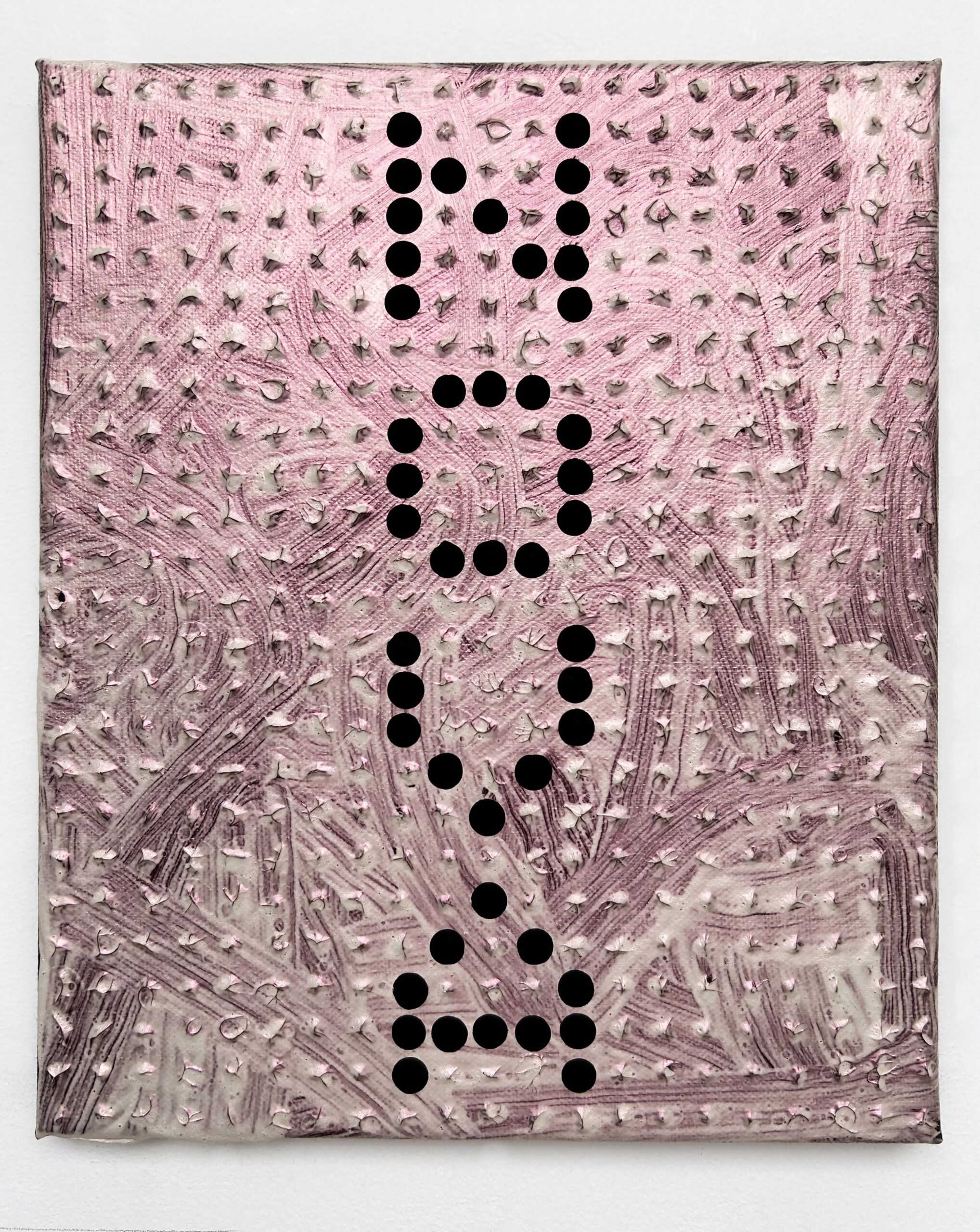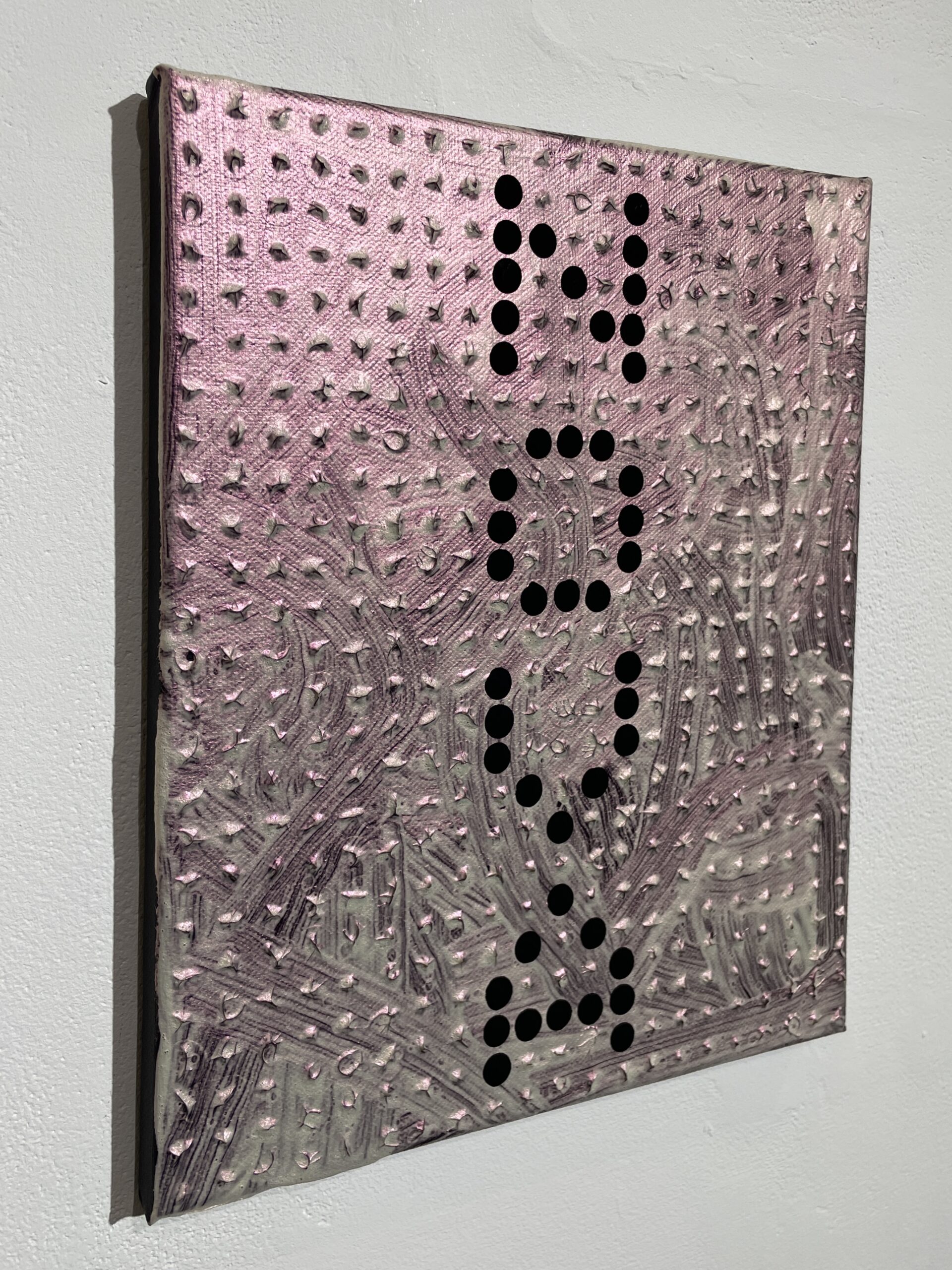 A celestial event producing a sudden bright ‘new’ star that eventually fades away to obscurity. This painting plays with variable optics and text as a poetic analogy. Opaque black underpainting is textured over with a matrix grid of impasto dots. This is thinly overpainted with chaotic and meandering pseudo gestural brush marks of interference colour, which appears red when seen head on, but white or faintly green when viewed obliquely or in thick accumulations. Specific patterns of the dot matrix blobs were sliced off to form the letters, which were reapplied with profoundly dark, non-reflective ‘Black 4.0’ acrylic paint.