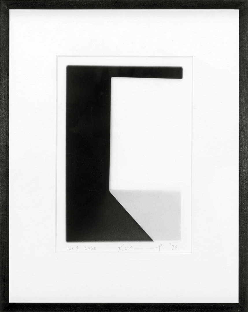 Photograms are a form of truth making; a 2D chronicle of a 4D happening. Shadows preoccupy me as they proclaim the existence of the object casting the shadow and the qualities of the emitting light. Capturing shadows in photograms is collecting the traces of existences. A gold cube was independently placed on the light sensitive photographic paper and a light was flashed. Light turns the silver gelatin black; the object shields the white of the paper and the ambient light forms shades of grey, creating an image in the negative, converting what is into what was.