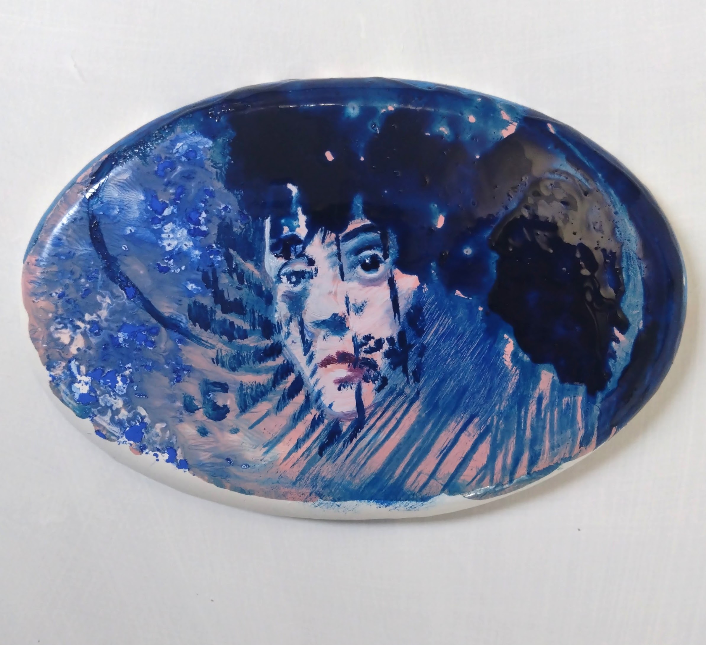 Inspired by the character of Lydia in the Beetlejuice movie, this painting generates a nostalgic gothic self-titled ‘bleu noir’, evoking melodrama, Victoriana and the huge influence of Gothic fiction from the 19th century on film noir and the advent of horror. The paint describing the face and hat disintegrates into a bigger void of darkness expressing the inadequacy of the individual in the face of the sublime vastness of nature.