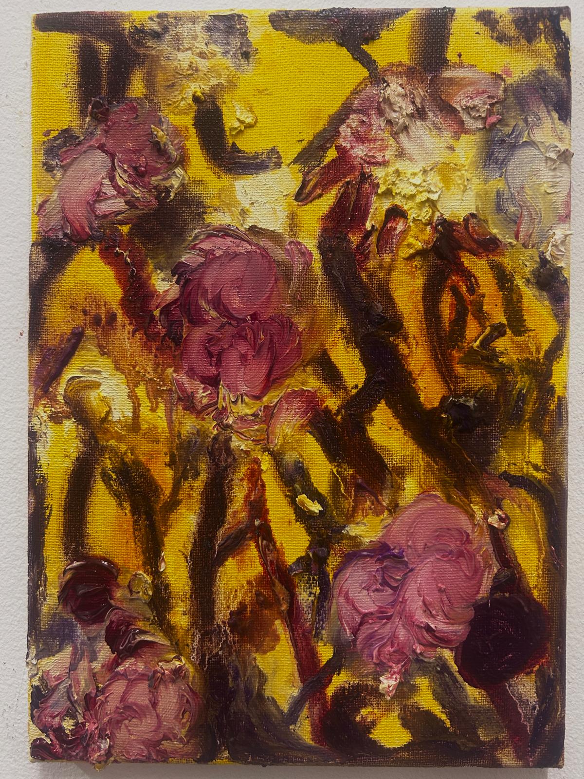 These paintings are part of a series. The intimate scale here demands close looking, and engagement from the viewer. Capturing what might seem incidental is crucial to me, for these paintings. That which is sometimes seen, happened upon, but forgotten about in the conscious memory, but held somewhere in the unconscious realm, has a particular hold for me. The intense light at a certain time of day, dawn or daybreak, flooding through branches, leaves and flowers has a central mystery that is, perhaps, impossible to capture. Those seemingly incidental experiences, which are transient, drive my making of these paintings.